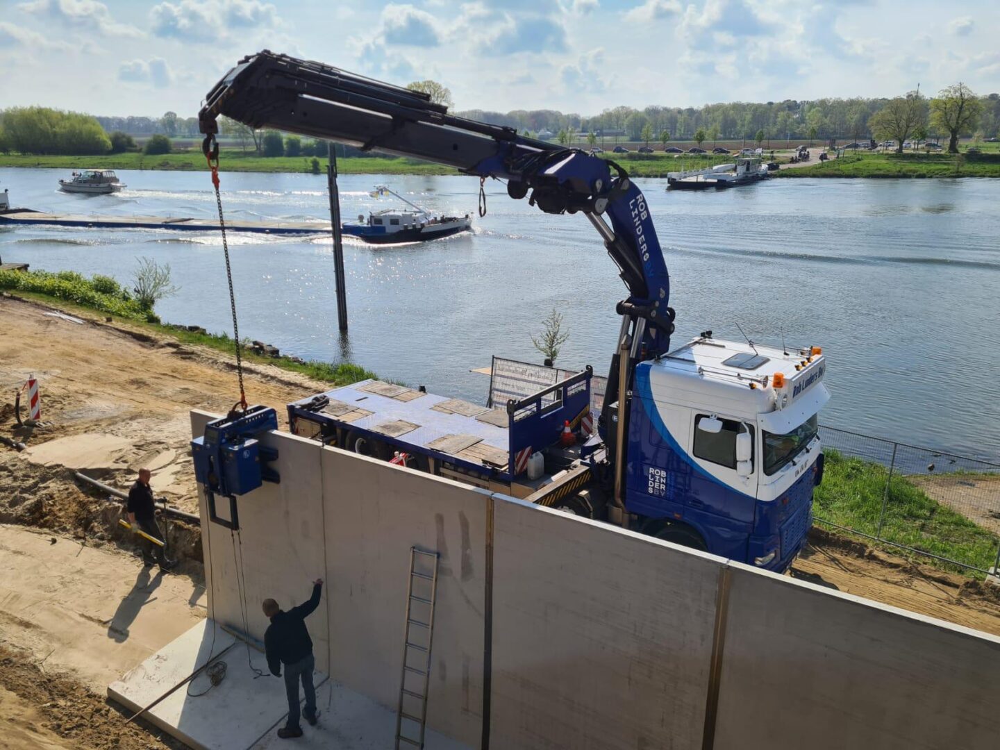 This project, which was implemented in May 2021, is evidence that you can use retaining walls to bridge considerable height differences. In Kessel (Limburg) close to the ferry, Rob Linders and Rob Janssen Grondverzet & laser-egalisering placed Bosch Beton retaining walls with heel varying in height from 2.5 to 3.5 metres. The residents created a swimming pool behind the 3.5-metre-high walls.
